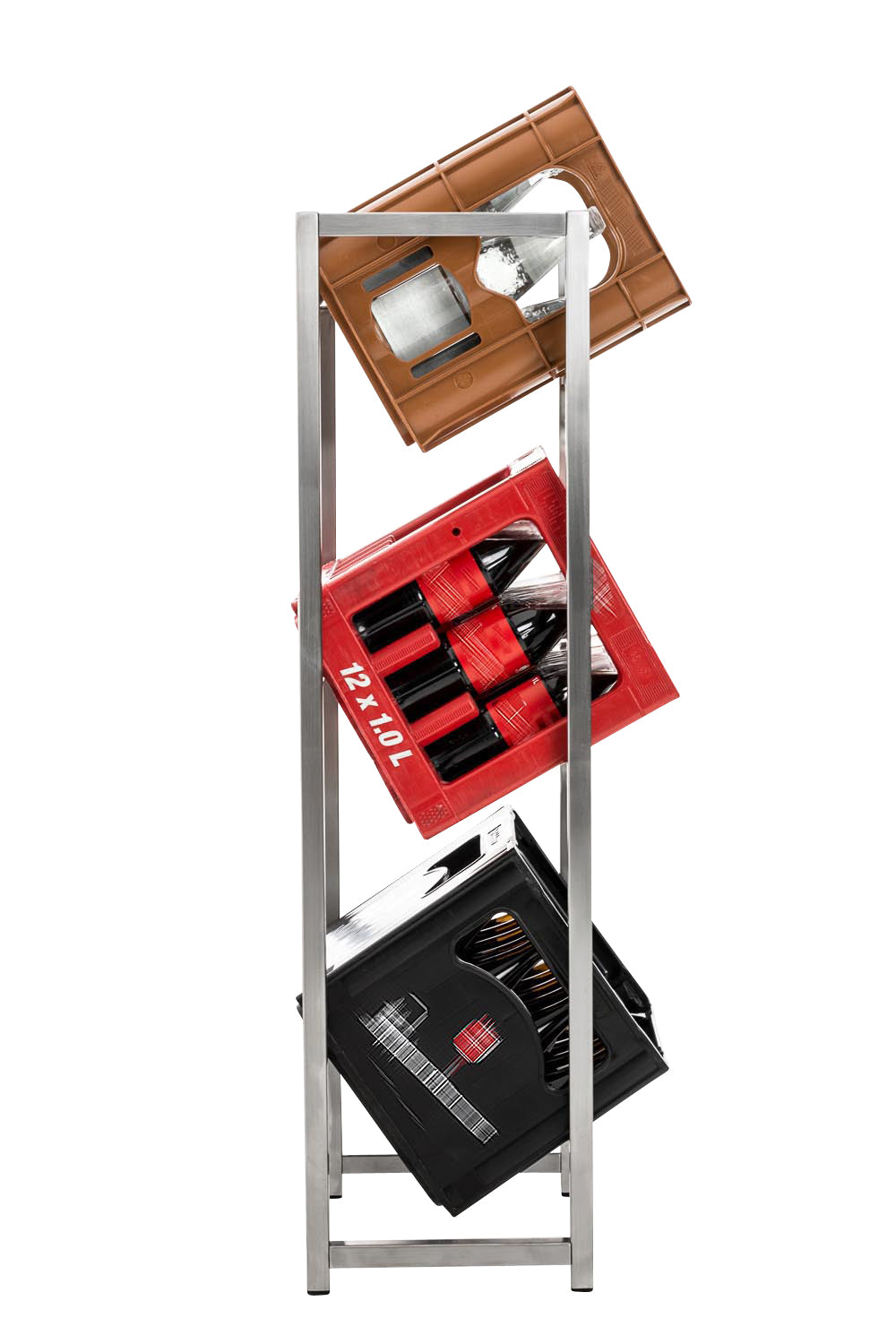 Dieser Getränkekistenständer kann sich sehen lassen! Er ist nicht nur praktisch, sondern auch ein hochwertiger Hingucker. Mit Hilfe der schrägen Positionierung der Kisten können die Flaschen jederzeit bequem entnommen und eingestellt werden. Der Ständer lässt sich ebenso mit anderen Behältern bestücken wie zum Beispiel mit Holzkisten. Dabei muss er nicht zwangsläufig im Keller landen: Durch seine edle Optik ist er besonders gut im Wohnbereich einsetzbar. Erhältlich ist er in 3 Varianten, aus matt-gebürstetem Edelstahl, Metall in Chromoptik und aus pulverbeschichtetem Stahl in matt-schwarz.